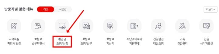 국민건강보험공단 홈페이지 로그인 후 메인메뉴의 환급금 조회 및 신청을 선택합니다.