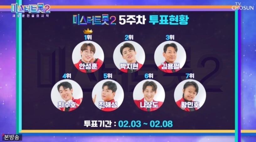 10위 박성온, 9위 송도현, 8위 안성훈, 7위 진해성, 6위 진욱, 5위 송민준, 4위 박지현, 3위 최수호, 2위 추혁진, 1위 나상도 순으로 TOP10에 오르게 됐다.