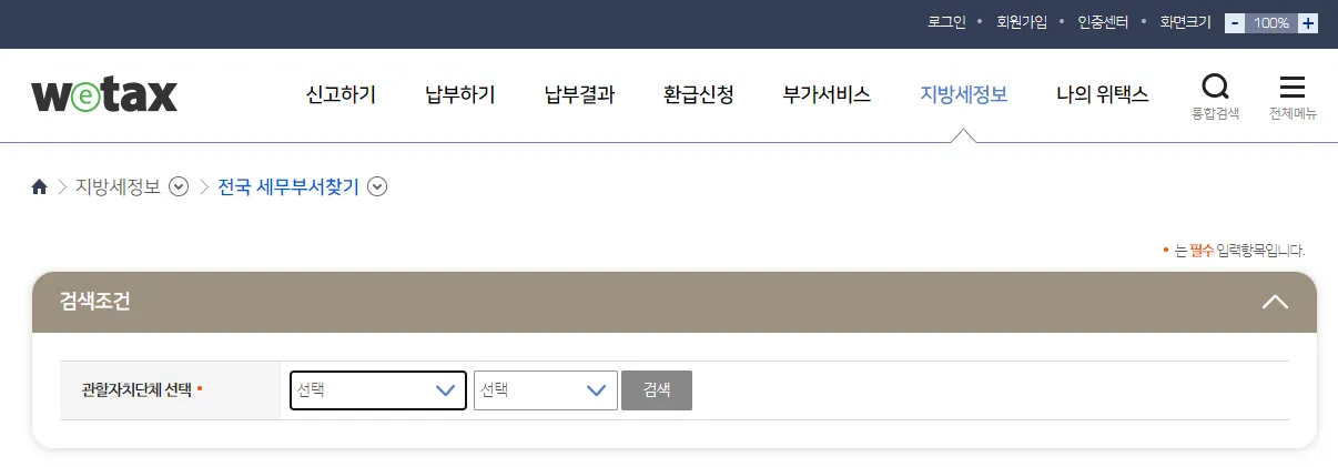 * 회원 : [로그인] -> 우측 상단 [전체메뉴] -> [신고하기] -> [신고내역] -> [지방세] -> 조회 조건 설정 후 [검색]