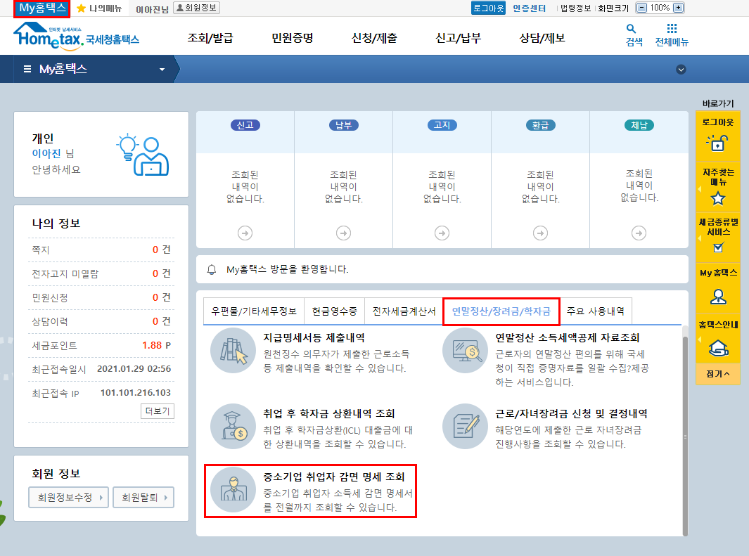 [중소기업 취업자 소득세 감면] 신청내용 확인하기