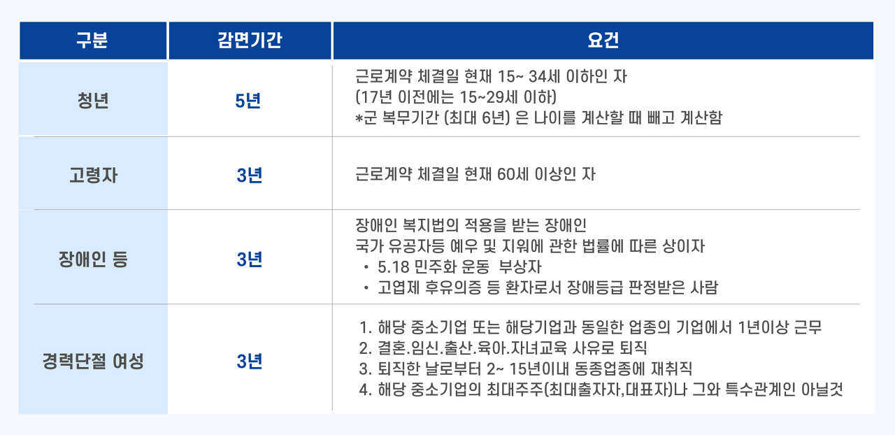 감면기간이 5년이며 근로계약 체결일 시점으로 15-34세 이하인 자가 해당합니다.