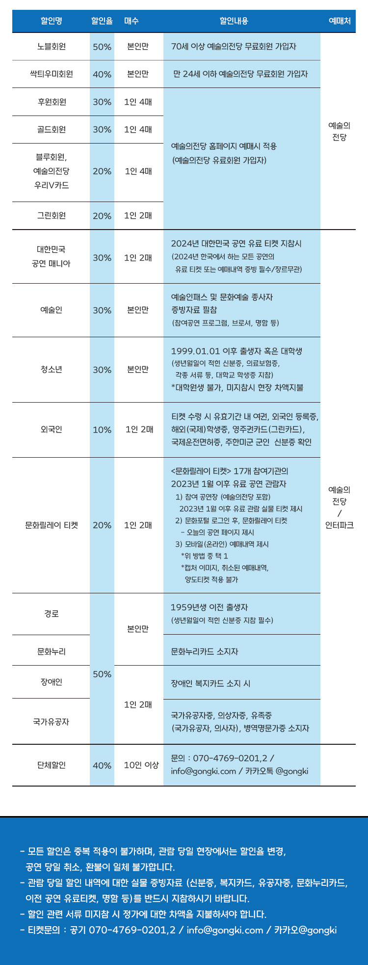 문화릴레이 티켓 할인 : 20% (문화릴레이 티켓 17개 참여기관의 2023년 1월 이후 유료 공연 관람자 / 1인 2매)