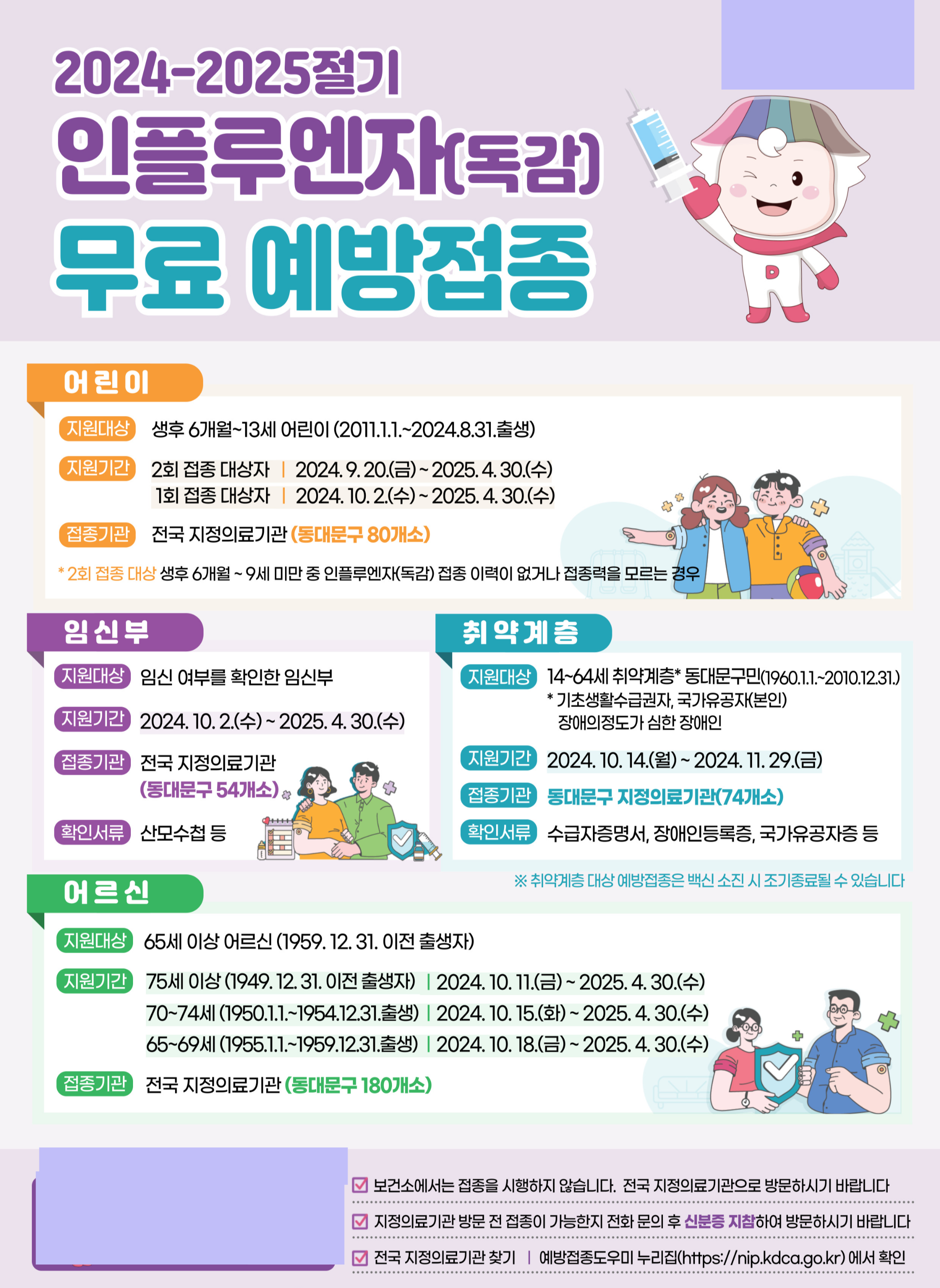 단, 안전한 접종 환경을 위해 독감(인플루엔자) 국가 예방접종은 연령별로 날짜가 구분되어 있으므로