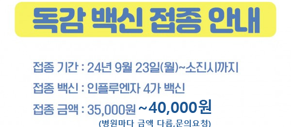 올해 독감예방 접종은 2024년 09월20일 부터 2025년 4월 30일까지 접종이 가능합니다.