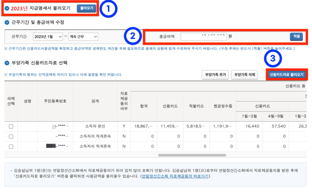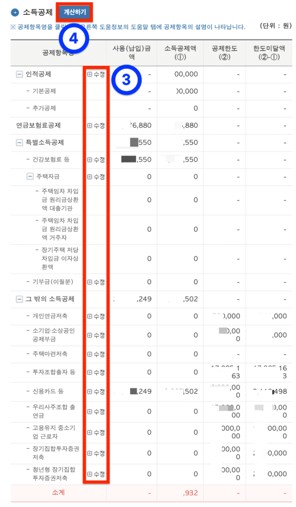 신용카드 사용액(직불카드, 대중교통 이용) 등을 입력해 주시고,